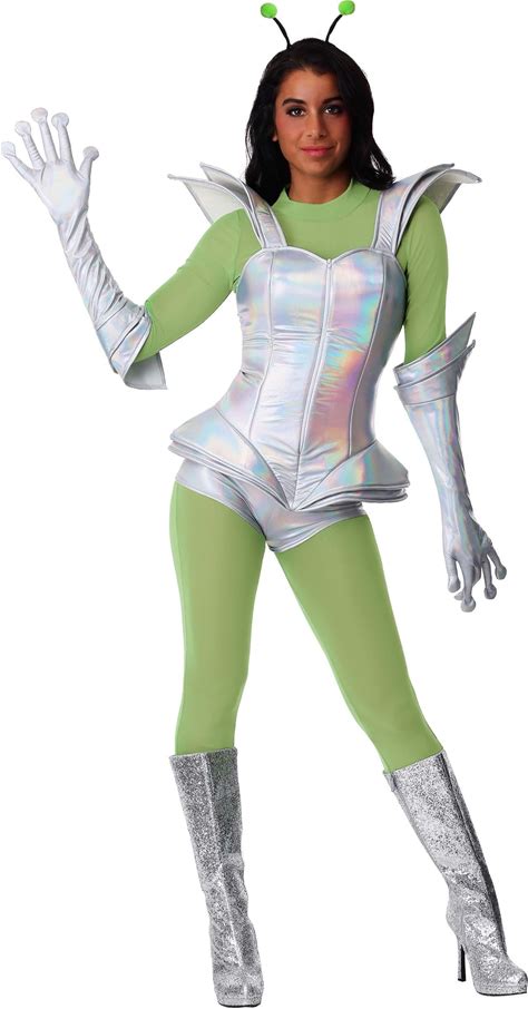 Alien Girl Costume Adult Women's Galactic Extraterrestrial Halloween Outfit: Mesh Shirt, Pants, Armor Vest, Gloves, Antennas